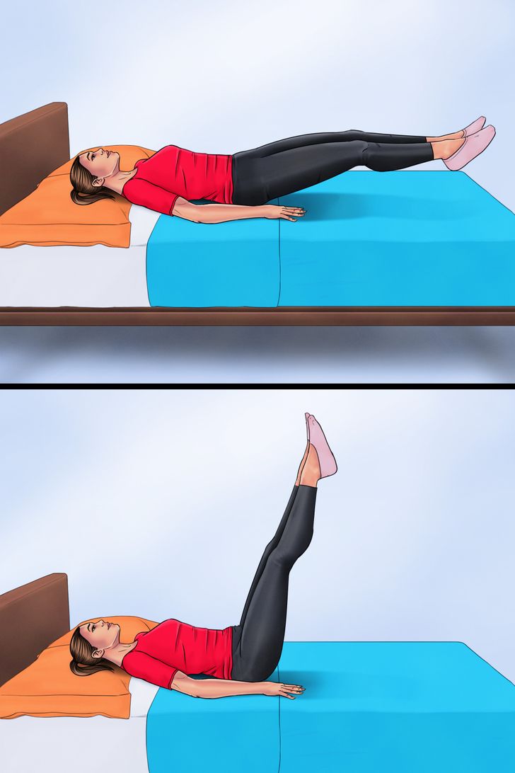 Bacaklar düz bir şekilde sırt üstü yatın. Kolları yana açın ve yatakla sabitleyin. Bacakları havaya kaldırıp düz bir şekilde indirin. Pozisyonu koruyarak bacakları tekrar kaldırıp indirin. Hareketi diğer bacak için de tekrarlayın.